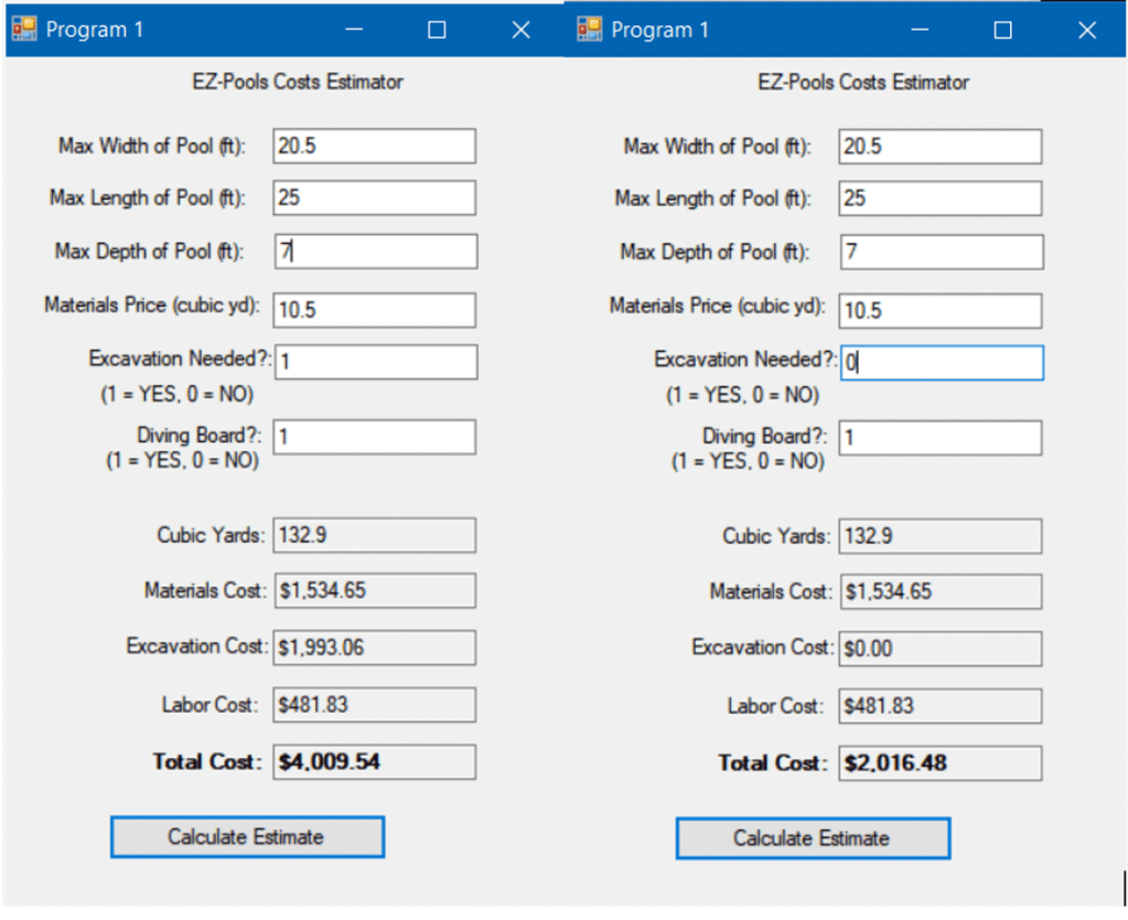 This program was written in Visual Studio using the C# language, providing a GUI for the user to input values for the dimensions of a pool. There are formulas used to calculate the cubic yardage, set material costs, excavation & labor costs, and a total cost.
