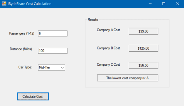 This program was written for the purposes of calculating and comparing costs between three rideshare companies. It was coded in the C# language and designed within Visual Studio. The GUI allows for users to input numeric values and select an option from the combo box for ‘Car Type’.