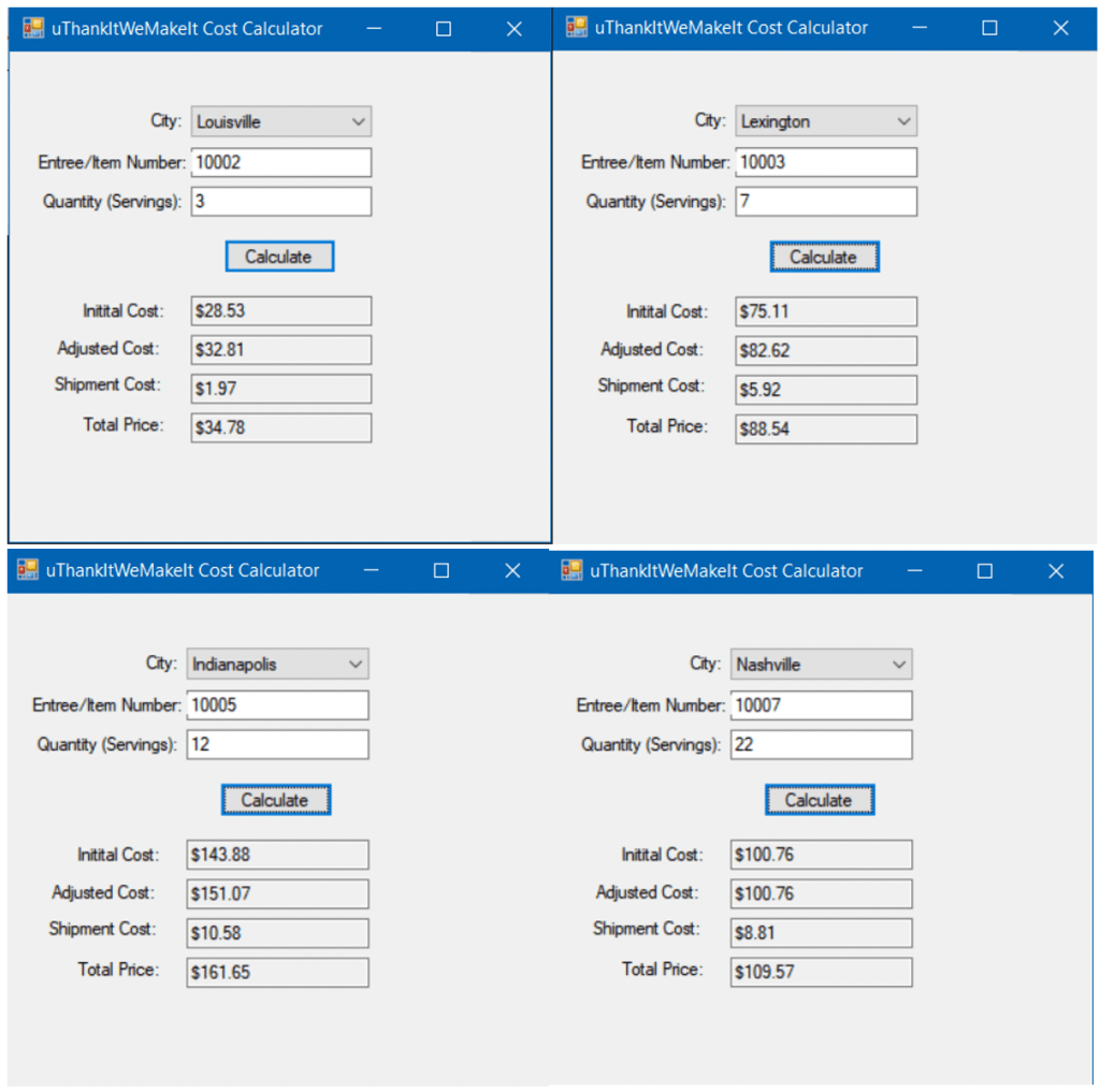 With this cost calculator, functions including the use of arrays and loops are implemented to track the user’s selections for calculations. The combo box sets the city value, along with numeric entries with validation to prevent issues in the calculation. Adjusted costs are found with the program and displays the values within the GUI for the user. This program also utilized the C# programming language.